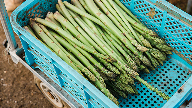 - 根津さんは、1人で収穫作業を行います。目で見ただけで、長さ26cm以上のものを素早く選定し、ハサミで手際よくカットして行くと、10分もかからずに容量6kgのコンテナがいっぱいに。今時期は1日1回の作業でコンテナ5、6個分を収穫します。気温が上がる夏は、アスパラガスの生育スピードが早くなるので、収穫は1日2回に。刈り取ったばかりのアスパラガスを見ると、切り口から水がぽたり。「これが新鮮な証拠だよ」と根津さんは微笑みます。春先のアスパラガスは、太さもどっしりしています。