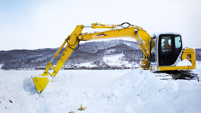 キャベツの緑 - 10月下旬、根切りと呼ばれる収穫作業を終えると、10畝分のキャベツをひとまとめにして畑に並べ、周囲に棒を立てます。これは、キャベツを掘り起こす頃、広大な畑一面が深さ1m以上もの雪に覆われても、ありかがわかるようにと考えられた知恵。福本さんは、パワーショベルで棒が立つ付近の雪を豪快にかき、緑の葉が見えたらキャベツを傷つけないようスコップや手で雪を払います。