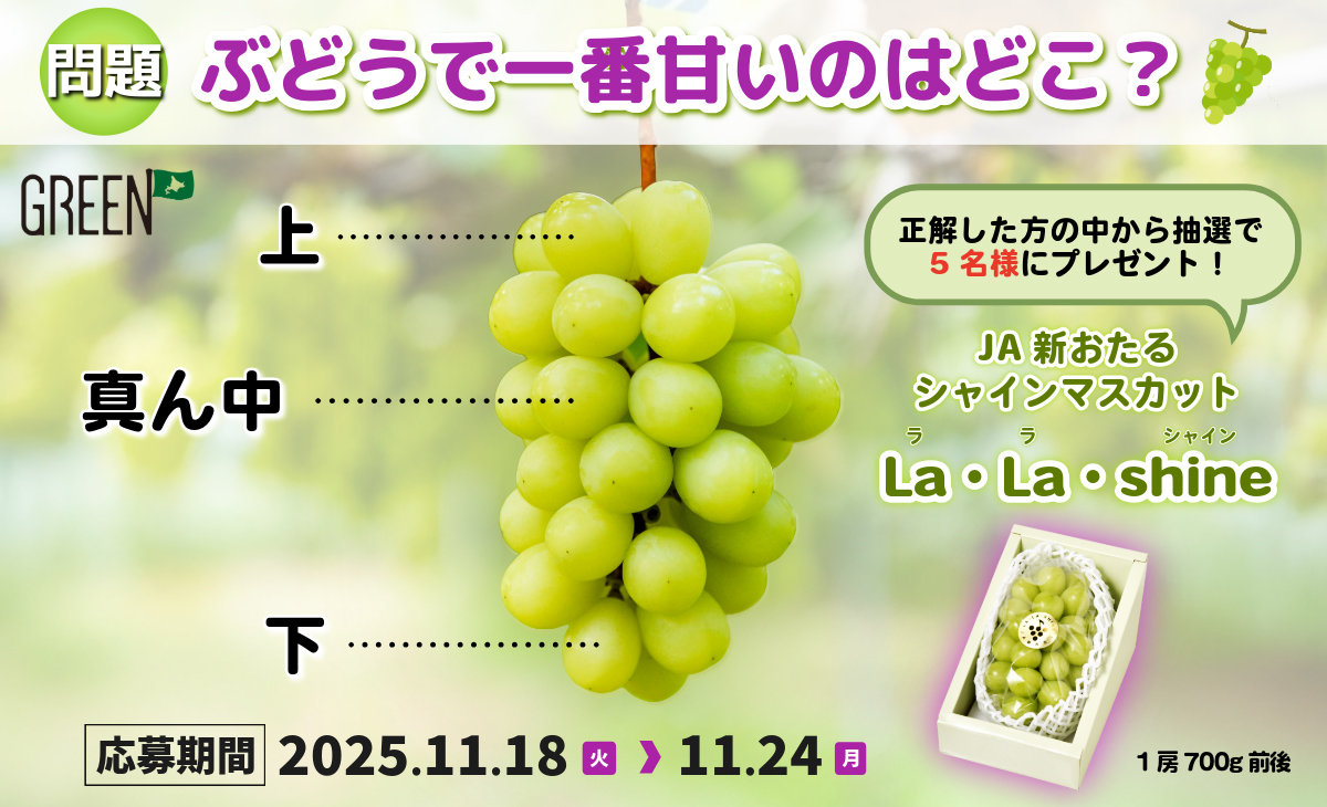 今回は、ぶどうの房の中で一番甘いのはどの部分かを引用ポストで答えていただきます。キャンペーンにご参加いただき、クイズに正解した方の中から、抽選で5名様に、【JA新おたる シャインマスカット『La・La・shine(ラ・ラ・シャイン)』】をプレゼントいたします。ぜひ、ご参加ください!