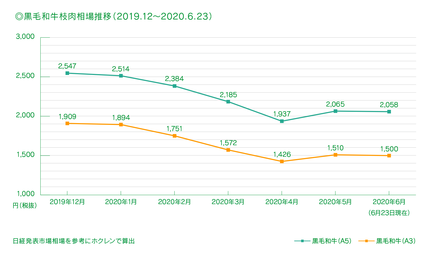 新型コロナウイルスの影響で、高級部位を中心とした国産牛肉の相場が急落。現在の相場価格は、昨年12月と比較して、約8割ほどまで落ち込んでいます。牛肉は、外食需要が多いため、飲食店の営業自粛などによるダメージが深刻です。和牛に限らず、乳用種肥育牛も含めた国産の牛肉が今、ピンチなのです。