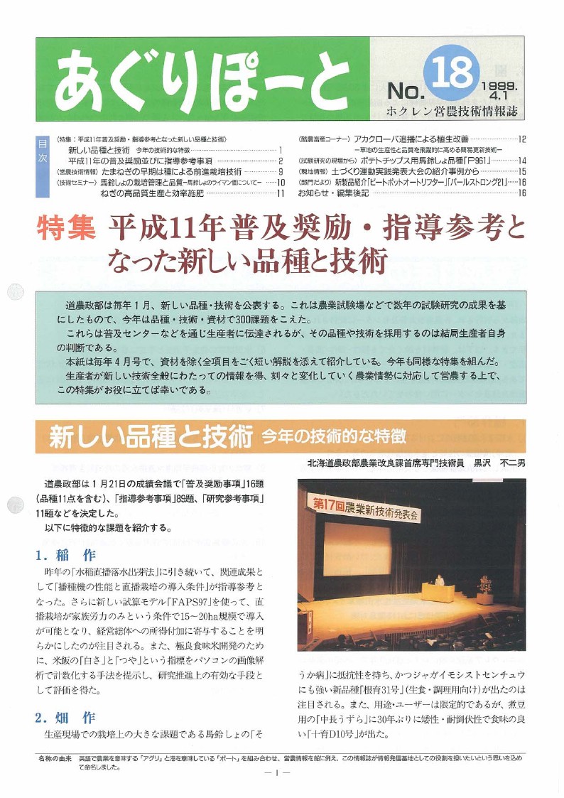 - No.18特集:平成11年普及奨励・指導参考となった新しい品種と技術